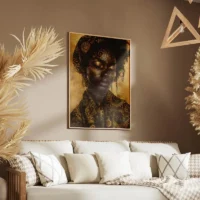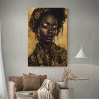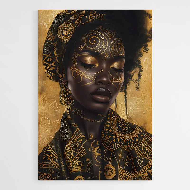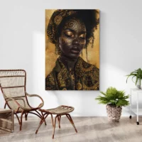 Ce Tableau femme noire dorée montre un portrait féminin. On voit une femme à la peau sombre, des touches dorées sur le visage et le cou, et un fond sombre qui fait ressortir les reflets métalliques. Le rendu mélange aplats de couleur et détails brillants. Les traits restent nets, l'attitude paraît posée, presque hiératique. On aime, on revient souvent sur le regard.