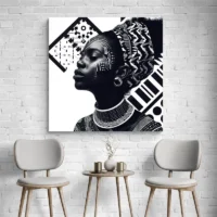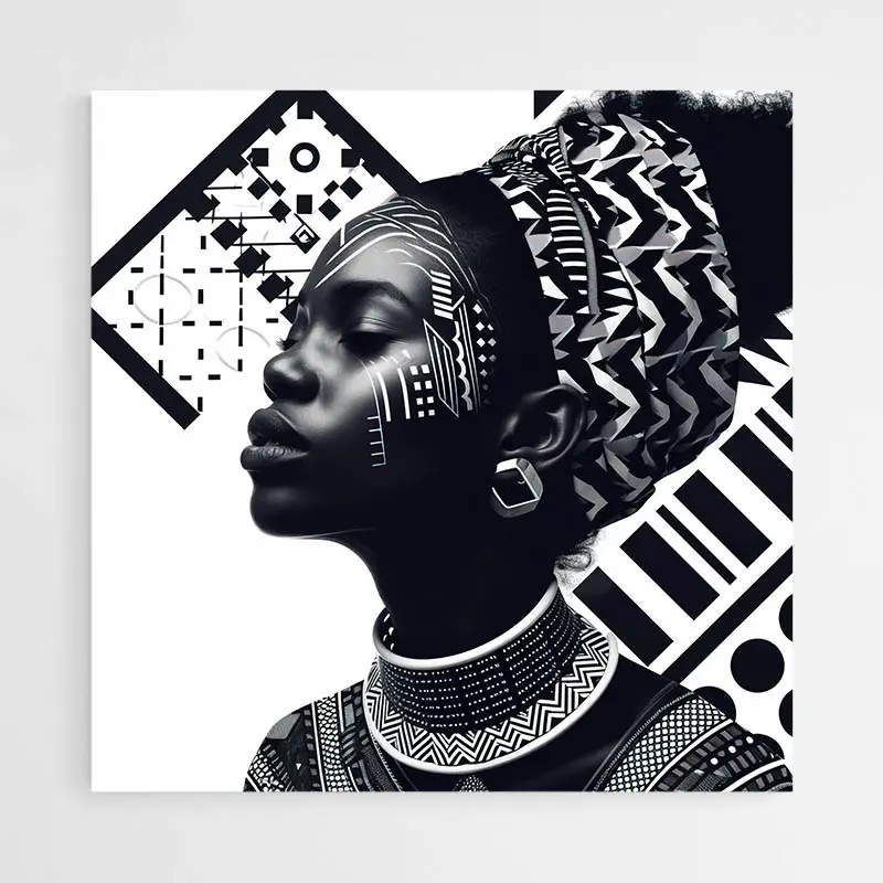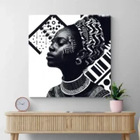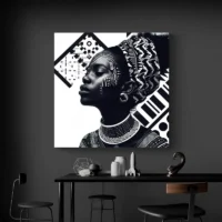 Le Tableau femme noire en noir et blanc montre un portrait en nuances de gris, très contrasté et graphique. On voit un visage féminin au premier plan, une peau sombre rendue par des tons profonds, des zones claires qui soulignent le front et les pommettes. Les lèvres, le nez et le regard restent nets, précis. Les cheveux apparaissent texturés et proches du crâne, la composition reste épurée, sans élément d'arrière-plan chargé, ce qui recentre l'attention sur le sujet. C'est calme, puissant, simple et fort.