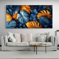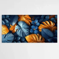 Ce Tableau feuilles bleues et dorées apporte une présence élégante sur le mur. On voit des feuilles bleues profondes, des feuilles dorées aux reflets métalliques, et un fond clair qui laisse respirer la composition. Les feuilles se superposent, leurs formes stylisées créent un rythme, et quelques touches dorées soulignent les nervures. Cette toile charme par son contraste entre bleu et or.