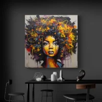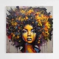Ce Tableau Fille Afro Graffiti montre un portrait féminin au centre. On voit une chevelure afro très volumineuse. Le visage apparaît net, aux traits stylisés. On remarque des lignes épaisses qui dessinent les contours, des touches de peinture qui jaillissent et un fond graffiti texturé. Les contrastes sont marqués, il y a des aplats et des éclaboussures, et une présence forte qui capte le regard.