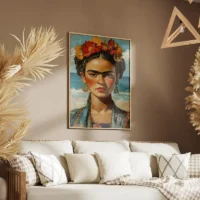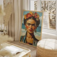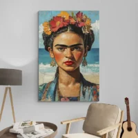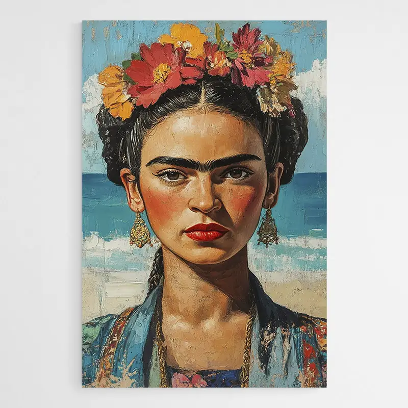 Ce Tableau Frida Kahlo Expressionniste attire le regard avec un visage féminin au centre. On voit des sourcils épais très marqués, une couronne de fleurs multicolores posée sur la tête et des lèvres rouge profond. Le fond bleu-vert donne de la profondeur. Des touches de peinture vives et des traits noirs autour des yeux ajoutent du caractère. Le rendu reste expressif, direct, presque rugueux par endroits.