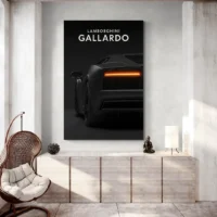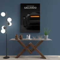 Ce Tableau Gallardo montre une voiture sportive vue de trois quarts, avec une carrosserie brillante et des reflets nets. On voit clairement des phares anguleux, des jantes imposantes et des prises d’air avant. Le fond sombre met en valeur la teinte vive de la carrosserie, et les lignes basses de la voiture donnent une impression de vitesse, immédiate, presque palpable.