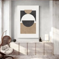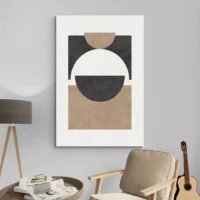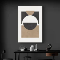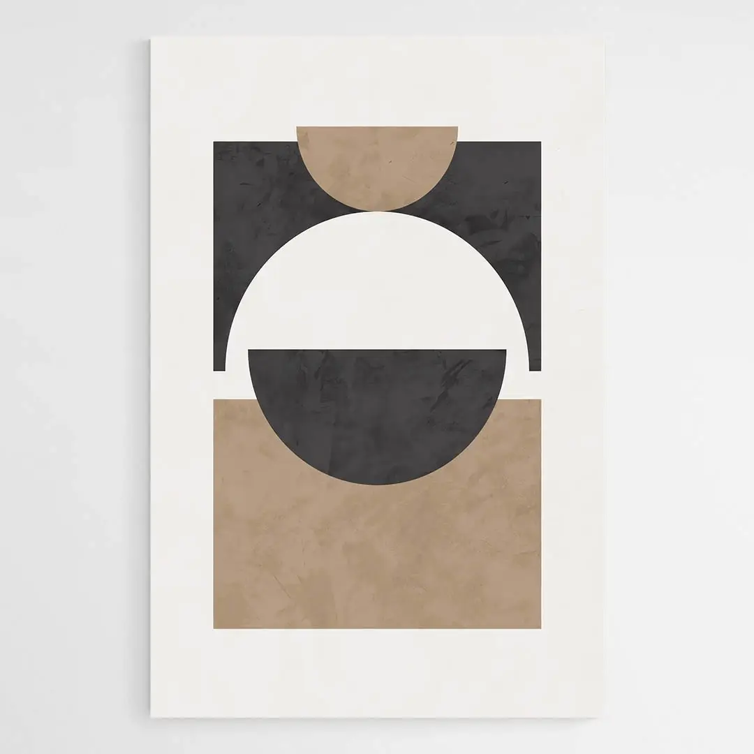 Ce Tableau géométrique minimal montre des formes nettes et peu d'éléments. On voit un grand cercle, un demi-cercle superposé et un rectangle aligné. Les couleurs restent sobres: beige chaud, terre cuite et noir. Le fond paraît clair, la surface sans texture apparente. Le contraste entre la forme ronde et l'angle droit crée un équilibre calme, simple et affirmé.