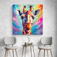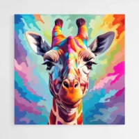 Ce Tableau Girafe Coloré présente un gros plan sur la tête et le long cou de la girafe. On voit des taches multicolores, des touches de jaune, bleu, rose et vert, appliquées comme des larges aplats et des éclaboussures. Le fond reste clair, presque blanc, ce qui magnifie les couleurs. Le regard de l'animal apparaît doux, avec un oeil sombre bien visible, et de longs cils qui soulignent l'expression. On remarque aussi les petites oreilles dressées et le museau aux contours nets. Le rendu reste net et contemporain.