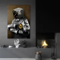 Ce Tableau Guerrier Moderne montre un visage de guerrier partiellement masqué, un casque aux lignes épurées et des traits graphiques très marqués. Le fond reste sombre et texturé, avec des touches dorées qui ressortent, et des contrastes forts entre noir et gris. On voit aussi des motifs géométriques près du cou, et une silhouette frontale qui capte le regard.