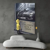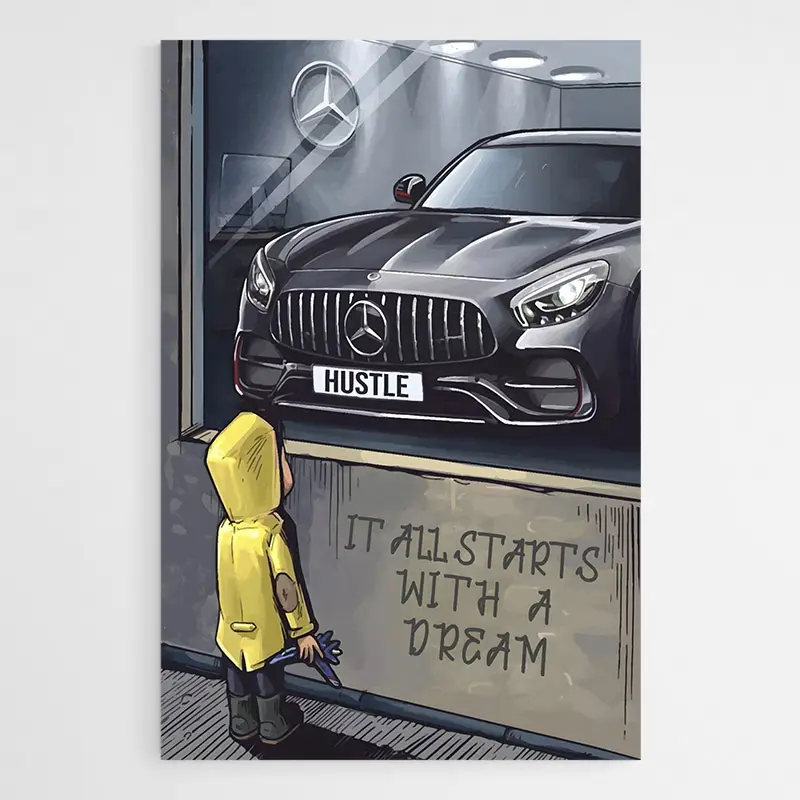 Ce Tableau It All Starts With A Dream joue sur la simplicité. Un message en lettres blanches occupe le centre, net et lisible. Le fond propose un dégradé bleu nuit, profond, qui passe du bleu foncé au bleu plus clair. On remarque aussi une lune fine en haut à droite, des petites étoiles dorées parsement l'espace et quelques nuages légers apportent de la douceur. Le rendu reste calme, presque silencieux, on sourit un peu, on y revient.