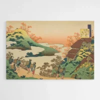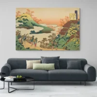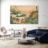 Ce Tableau Japonais Paysage - Hokusai saisit le regard avec une grande vague indigo qui monte et se recourbe. On voit les crêtes blanches en forme d'embruns, des petits bateaux penchés sous la force de la mer, et au loin le Mont Fuji, calme et discret. Le ciel présente des bandes beiges et des nuances claires qui équilibrent l'ensemble.
