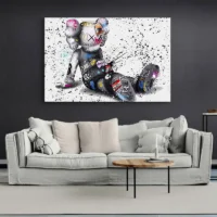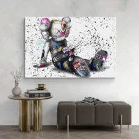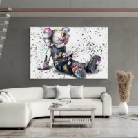 Ce Tableau Kaws affiche un grand personnage stylisé au centre. On voit une tête ronde marquée par des yeux en croix, des contours noirs bien épais qui découpent la silhouette, et des mains gantées blanches qui ressortent fortement. Le corps présente des nuances de gris, le fond reste uni et clair, beige ou crème, ce qui fait ressortir les formes. L’ensemble donne une impression nette, directe, presque sculpturale.