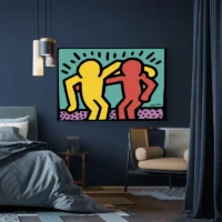 Ce Tableau Keith Haring Best Buddies frappe par ses lignes franches et son contraste net. On voit deux personnages stylisés, silhouettes rondes et simplifiées, tracées au trait noir, enlacés comme dans une danse. Le fond rouge vif fait ressortir le blanc des figures, des petites lignes rayonnantes entourent les corps, et quelques formes géométriques ponctuent l'espace. L'image respire le mouvement, le rythme, la joie immédiate.