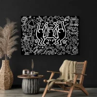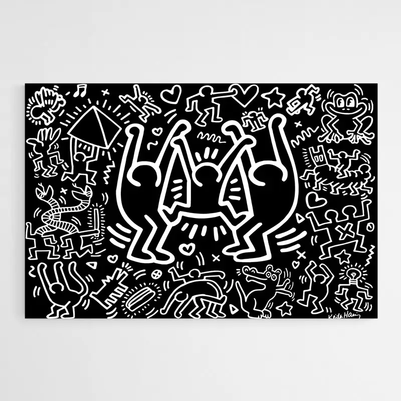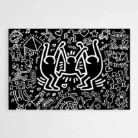 Ce Tableau Keith Haring Noir impose son contraste immédiatement. Un fond noir profond accueille des silhouettes en blanc, des lignes épaisses et continues dessinent les contours. On distingue des figures humaines stylisées, des formes arrondies et des espaces négatifs qui créent du rythme. Les contours restent simples, puissants, presque comme des pictogrammes en mouvement.