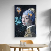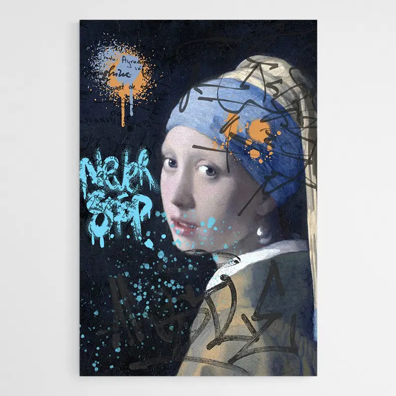Ce Tableau la Jeune Fille A la Perle Graffiti montre un portrait féminin inspiré du classique, revisité sur un fond qui ressemble à un mur peint. On distingue le visage en trois-quarts, le turban bleu bien présent, la perle brillante qui capte la lumière. Des traits à la bombe, des coulures et des éclaboussures viennent recouvrir le visage par endroits. Le fond garde une texture murale et quelques pochoirs en noir et blanc ajoutent du relief.