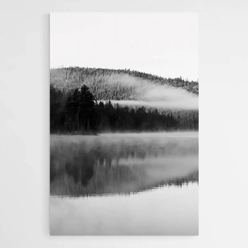 La palette privilégie les bleus et gris, avec des touches de vert discret qui évoquent la forêt. Le style reste réaliste mais apaisant, et l'ensemble donne une impression d'espace, idéal pour un mur libre ou minimaliste. Cette pièce parle à ceux qui aiment la nature et les paysages tranquilles.