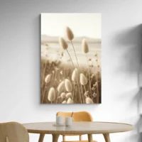 Ce Tableau Lagurus met en avant des épis duveteux posés sur un fond blanc cassé. On voit des tiges fines et élégantes, des pompons beige sable et une lumière douce qui fait ressortir la texture moelleuse. Les ombres légères apportent un relief discret et renforcent l'effet tactile. Le rendu reste épuré, calme, presque silencieux, et il attire l'œil sans l'excès.