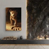 Ce Tableau Le Roi Lion attire le regard par sa figure majestueuse. Le lion est représenté en gros plan, avec une crinière abondante et dorée qui capte la lumière. Le regard est profond, presque sage, et le fond sombre met le sujet en relief. On perçoit des touches de sable et de brun, des détails texturés qui donnent une impression de relief graphique. L’ambiance est sauvage et noble, prête à devenir le point focal d’un salon ou d’une entrée.