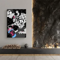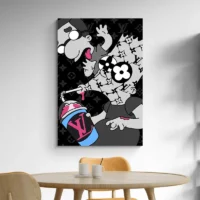 Ce Tableau Louis Vuitton Bart frappe par ses couleurs franches et son caractère immédiatement reconnaissable. On voit un visage jaune vif aux contours noirs, des piques de cheveux bien marqués et des yeux ronds blancs. Le fond montre un motif marron parsemé d’éléments beige qui évoquent le monogramme Louis Vuitton. Les traits nets donnent un rendu très graphique.