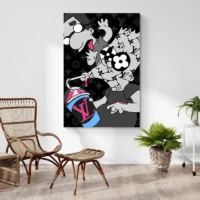 On ressent une énergie vive, presque malicieuse. Le contraste entre le jaune intense et le fond marron crée du relief. Ce tableau plaira aux amateurs d’images familières détournées, aux amateurs de bande dessinée ou à ceux qui cherchent une déco qui claque, qui claque vraiment. Il donne un côté urbain et contemporain à la pièce.