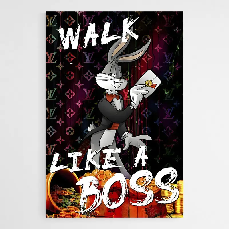 Ce Tableau Louis Vuitton Bugs Bunny met le célèbre lapin en gros plan, bien reconnaissable avec ses longues oreilles, son regard malicieux et son sourire. L'arrière-plan affiche le motif monogramme Louis Vuitton, avec des tons marron et beige dominants. On voit aussi des touches de gris sur le pelage et un contraste net entre le sujet et le fond. C'est une image qui frappe, qui attire, qui reste en mémoire.