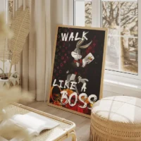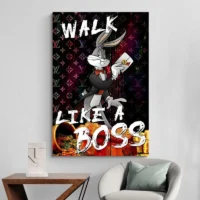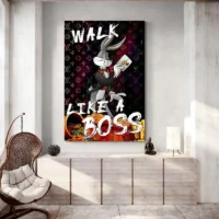 On sent l'alliance du dessin animé et du motif de luxe. Ce tableau plaira aux amateurs d'images fortes, aux fans de bande dessinée, et à ceux qui aiment une déco qui ose. L'effet recherché : un mur qui capte le regard, une ambiance à la fois ludique et affirmée. On ressent du dynamisme et un petit sourire chaque fois qu'on le regarde.