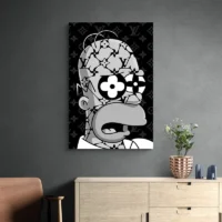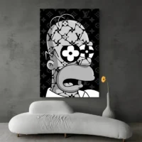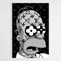 Ce Tableau Louis Vuitton Homer mélange un portrait cartoon à des motifs de luxe. On voit un visage jaune aux contours noirs nets, de grands yeux ronds et des traits simplifiés. Quelques cheveux en arcs et des points de barbe apparaissent sur la mâchoire. Autour du portrait, des motifs monogramme LV marron et doré sur un fond clair créent un fort contraste. Le trait reste net, presque graphique.