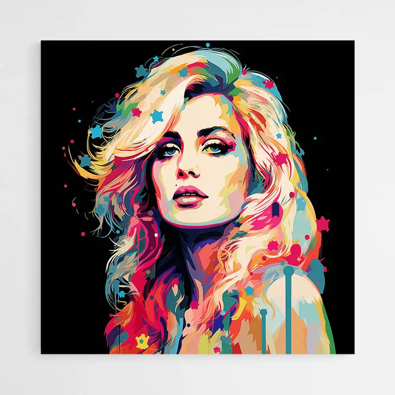 Ce Tableau Madonna Pop Art capte le regard avec un portrait féminin en gros plan, des lèvres rouges brillantes, des cheveux blonds et des traits noirs marqués. Le fond affiche des aplats vifs: jaune, bleu et rose, et des motifs de points rappellent la trame classique du pop art. On sent l'énergie immédiate, lumineuse, presque rythmée, et oui, on sourit un peu en regardant.
