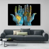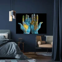 On ressent tout de suite l’envie d’explorer. Ce tableau séduira les voyageurs, les passionnés de géographie et ceux qui aiment une déco sobre mais marquante. L’ambiance reste calme et réfléchie. Le contraste entre le motif main et les détails de la carte attire le regard et donne du caractère sans surcharge.