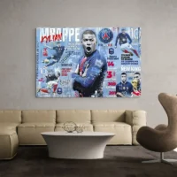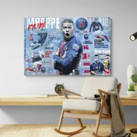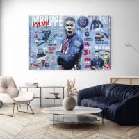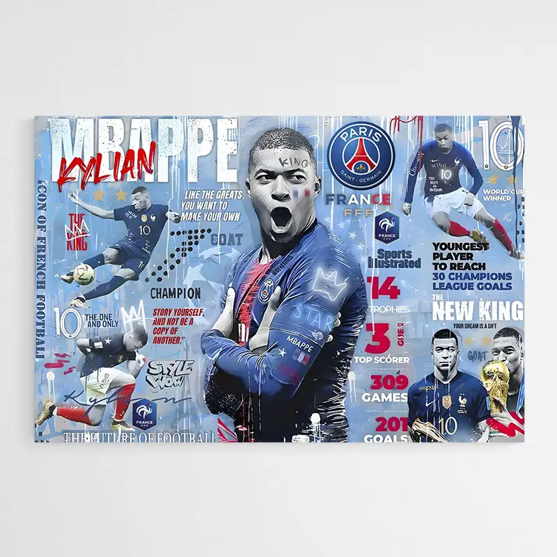 Ce Tableau Mbappe capte le regard dès le premier instant. On voit le visage en gros plan, les cheveux très courts, le front marqué. Le regard reste fixé, concentré. La bouche est fermée, l'expression sérieuse. Le fond sombre met en valeur le contraste. On ressent de la force, de la tension, oui, une présence presque palpable.