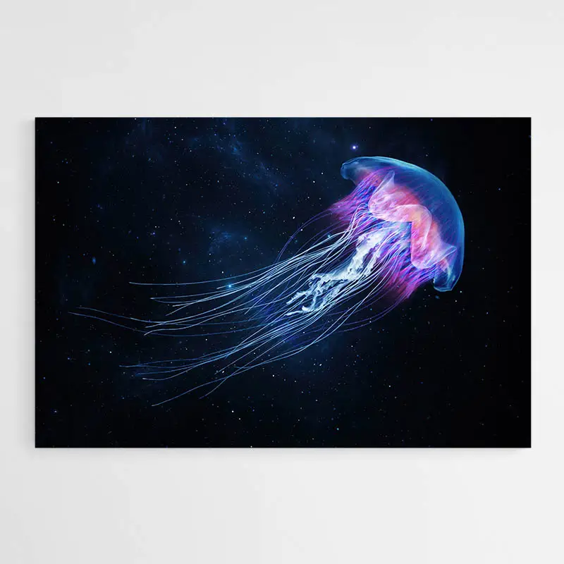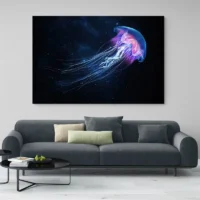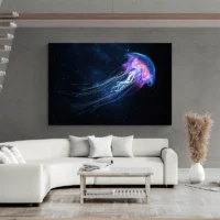 Le Tableau Méduse montre une méduse en gros plan, au centre du cadre. On voit un corps rond et translucide, des tentacules longs et fins qui ondulent. Le fond sombre fait ressortir des touches lumineuses, des reflets qui tirent vers le bleu et le violet. L'ensemble dégage calme et mystère, presque hypnotique.