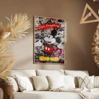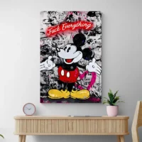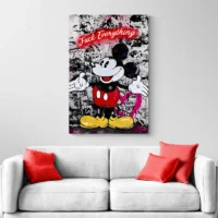 Ce Tableau Mickey Mouse Street Art présente Mickey en gros plan, bien reconnaissable. On voit ses grandes oreilles rondes noires, ses gants blancs et son short rouge orné de deux boutons blancs. Les contours s’affichent en traits noirs marqués. Le fond montre des éclaboussures de peinture et des inscriptions façon pochoir. Le rendu donne une allure vive et un peu rebelle, avec des taches de couleur qui accrochent l’œil.