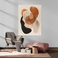 Ce Tableau minimaliste abstrait orange et noir capte le regard par sa simplicité. On voit un fond clair presque blanc, une grande forme orange aux contours arrondis et plusieurs marques noires qui ponctuent l'espace. Les contrastes sont nets, couleurs franches, zones pleines et vides qui se répondent. L'image reste sobre, presque scandée, on sent l'équilibre entre la forme ronde orange et les lignes noires. On remarque aussi des espaces vides qui respirent.