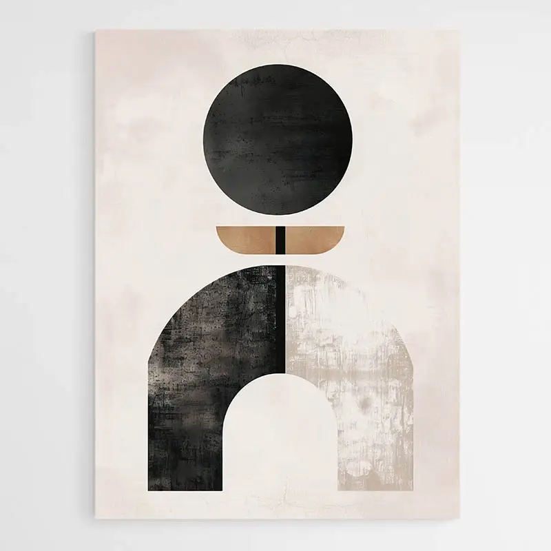 Ce Tableau minimaliste formes géométriques mise sur la simplicité : fond blanc, grand demi-cercle beige, cercle ocre et un fin trait noir. On voit aussi un petit rectangle brun posé sur la gauche et des espaces blancs généreux qui laissent respirer la composition. Les formes se superposent légèrement et créent un contraste net entre pleins et vides, très apaisant.