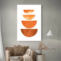 Ce Tableau minimaliste orange affiche une grande forme orange vive sur un fond clair. On voit un cercle orange franc, une petite forme beige et une fine ligne noire qui traverse discrètement la composition. Les bords restent nets. L’ensemble respire le calme, mais il attire vite le regard, on le remarque, on y revient. Le rendu paraît mat et soigné.