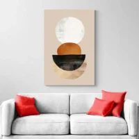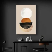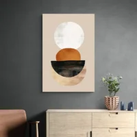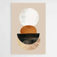 La palette se limite au orange, au beige et au noir sur une base crème. L’espace vide joue un rôle important. La géométrie simple donne un rendu moderne et reposant. Ce tableau plaira à qui aime les ambiances épurées, les intérieurs sobres et les touches de couleur sans excès. Il crée une atmosphère chaleureuse et sereine, presque méditative.