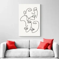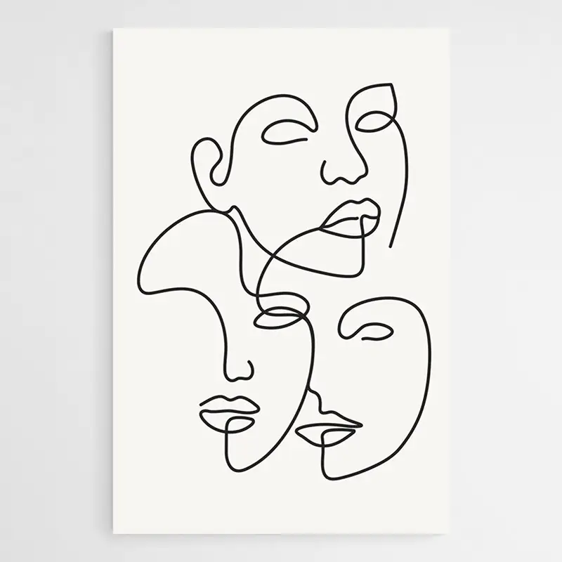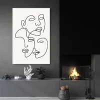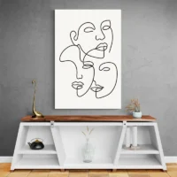 Ce Tableau Minimaliste Visage montre un visage stylisé dessiné d’un trait noir fin sur un fond clair. On remarque un œil suggéré par une courbe, la ligne élégante du nez, et une bouche simple, discrète. Un grand motif ocre sable vient souligner la joue et crée un contraste doux. L’ensemble reste épuré, avec des formes arrondies et peu d’ornement, presque méditatif, presque silencieux. Le trait reste constant, sans fioriture.