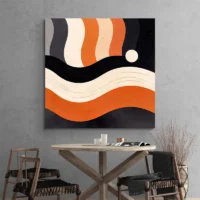 Ce Tableau Moderne Orange attire le regard par sa dominante orange intense, un grand cercle central, et des zones claires qui l'entourent. On distingue aussi des lignes fines noires qui créent du contraste et des touches beige qui apportent douceur. La surface paraît mate, les contours restent nets. On se sent tout de suite dans une ambiance chaleureuse, stable et accueillante.
