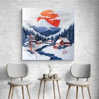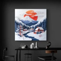 Le rendu reste très graphique et minimaliste. On ressent de la sérénité, un calme presque zen. Ce tableau plaira à celui qui aime l’art japonais, les formes épurées et les contrastes doux. Il évoque la montagne, le ciel rouge du lever ou du coucher, et la précision d’un travail papier découpé.