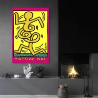 Ce Tableau Montreux Keith Haring impose le rythme dès le premier regard. On voit des personnages stylisés tracés en contours noirs épais, des lignes de mouvement qui éclatent autour d’eux et des aires de couleur vive qui se répondent. Le contraste noir contre une palette chaude apporte une présence franche. L’ensemble paraît joyeux, vif et très percutant.