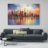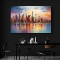 On ressent ici une ambiance à la fois calme et dynamique. Les lignes verticales des immeubles offrent de la hauteur, le pont donne de la profondeur, les reflets ajoutent du mouvement. Ce tableau plaira aux personnes qui aiment les vues urbaines, les scènes nocturnes ou simplement l'énergie contenue d'une ville iconique. C'est une affiche sobre, élégante, qui sait se faire remarquer sans trop en faire.
