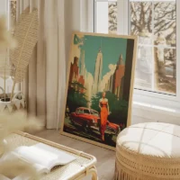 Sur un mur blanc, les tons sépia ressortent; sur un mur gris, l’ambiance devient plus intime. Associer avec des meubles en bois foncé, des cadres fins noirs, ou d’autres affiches de ville. Pour compléter cette mise en scène, voyez nos tableaux rétro ou nos tableaux New York.