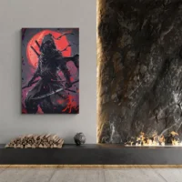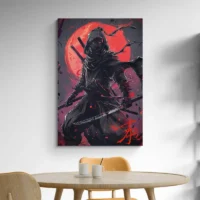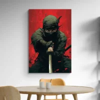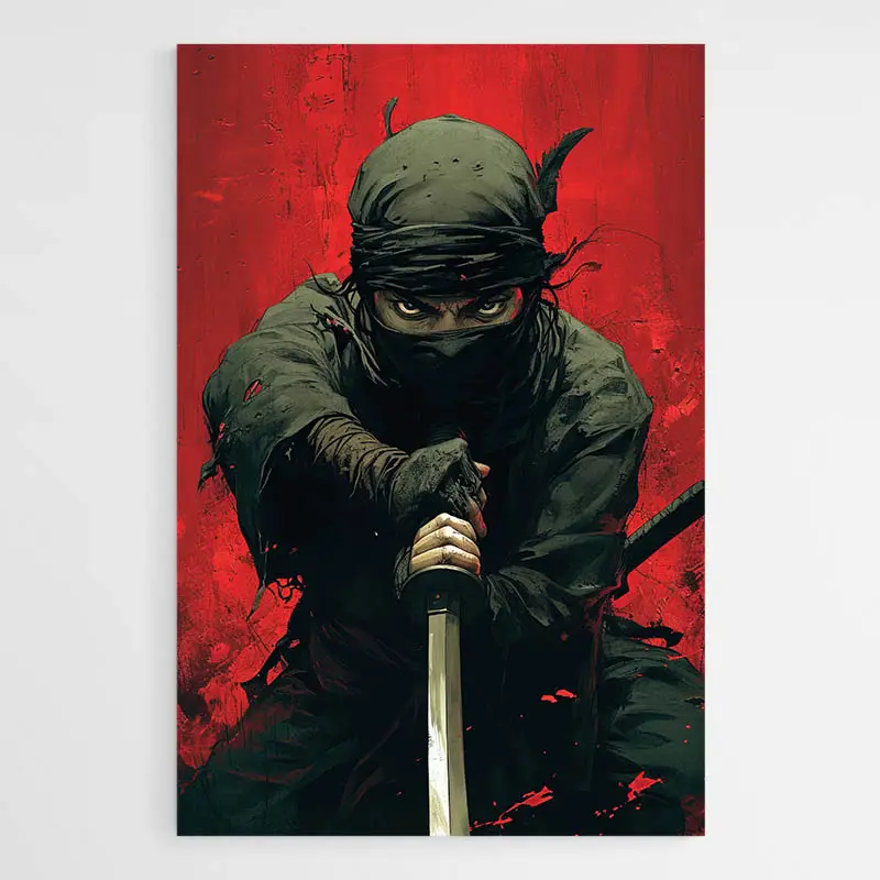 Ce Tableau Ninja et Katana frappe par son contraste et sa simplicité. On voit un ninja en tenue noire, le visage partiellement masqué, un katana tenu en avant avec une lame brillante. Le fond présente un cercle rouge intense qui attire l’œil, et des éclaboussures d'encre noire ajoutent du mouvement. Les lignes restent nettes, les zones d'ombre profondes et les touches de rouge font vibrer la composition. On ressent une tension, une concentration, on sent le calme avant l'action.
