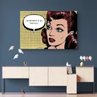 Ce Tableau Old School Pop Art saute aux yeux avec des couleurs franches et une énergie immédiate. On voit un visage stylisé en gros plan, des lèvres rouge vif, des cheveux jaune lumineux, et une trame de points qui forme le fond. Les contours noirs très marqués structurent l’image. L’ensemble donne une ambiance rétro et vive, vraiment vive, presque électrique, qui captive sans forcer.