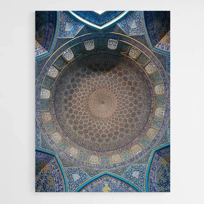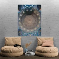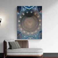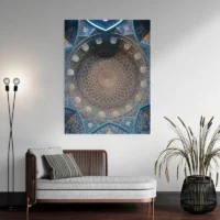 Cette toile joue sur la symétrie et le contraste entre le bleu et des accents lumineux. Elle donne une impression apaisante et presque méditative. Elle séduira la personne qui aime les ambiances orientales, les motifs traditionnels, ou qui cherche un point focal sobre mais distinct. On ressent une élégance contenue, un calme qui reste présent.