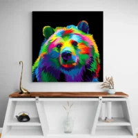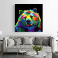 Ce Tableau Ours Pop Art frappe par son tracé net et ses couleurs franches. On voit la tête d'ours en gros plan, des aplats de jaune, cyan et magenta, et des contours noirs marqués qui soulignent chaque forme. Le regard droit et le nez sombre donnent une présence forte, le contraste attire de suite l'œil.