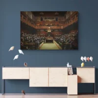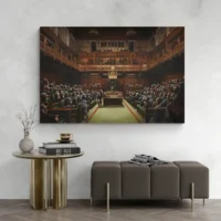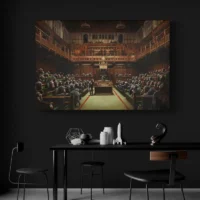 Ce Tableau Parlement Des Singes montre un groupe de singes réunis comme dans une assemblée. On voit plusieurs animaux assis sur des bancs, des postures différentes, des têtes qui se tournent. Les visages affichent des expressions variées, curieuses, sérieuses, parfois attentives. Les tons dominants restent bruns et ocres, avec des touches claires qui soulignent quelques pelages. L’image donne envie de regarder chaque personnage, encore, encore, on détaille.