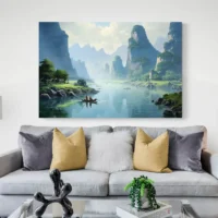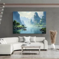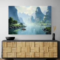 On ressent immédiatement calme et lenteur, très apaisante, très reposante. Le trait rappelle la peinture à l'encre traditionnelle, les touches restent maîtrisées et légères. Il plaira aux amateurs d'art oriental, aux personnes qui cherchent une déco sereine, et à ceux qui aiment les paysages minimalistes mais riches en subtilités. Il convient pour un salon, un bureau ou un coin lecture.