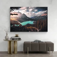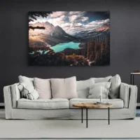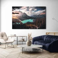 Sur un mur blanc ou bois clair, les bleus ressortent très bien. À côté d'objets en matière naturelle, la scène gagne en chaleur. Pour compléter l'ensemble, découvrez nos autres paysages ou nos tableaux montagneux sur tableaux paysage et tableaux montagne.