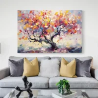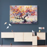 Le style reste épuré et artisanal, avec des traits visibles et une palette contenue. Ce tableau séduira la personne qui aime la nature et les images symboliques. On ressent une atmosphère tranquille, presque méditative, et on se sent plus posé face au mur. La composition reste assez centrale, concentrée sur l'arbre, et invite au repos visuel.