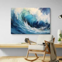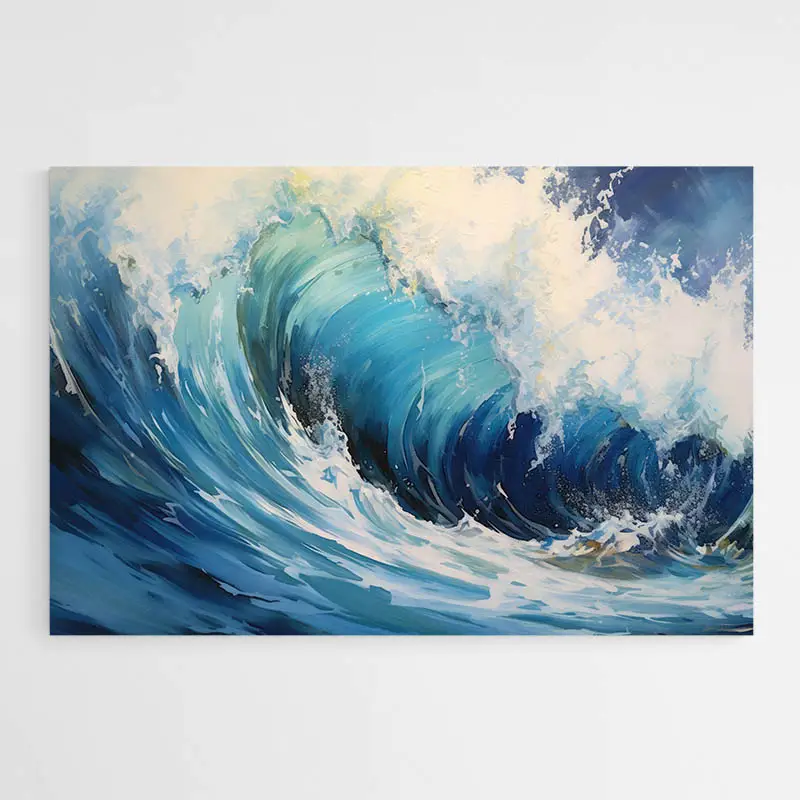 Ce Tableau peinture mer moderne capte d'abord les nuances de bleu: bleu profond, bleu outremer et vert d'eau plus clair. On distingue des bandes horizontales nettes, des éclats de blanc qui suggèrent des vagues, et une ligne d'horizon sobre. La peinture montre une matière visible, des coups de pinceau larges et texturés, parfois granuleuse. Le contraste entre parties sombres et touches lumineuses donne du mouvement. On ressent une sensation d'air marin, calme et revigorant, calme et revigorant.
