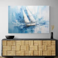 Ce Tableau peinture voilier moderne montre un voilier en gros plan, posé sur une mer aux nuances de bleu. On voit des voiles blanches bien visibles, une ligne d'horizon basse et des reflets clairs sur l'eau. Les coups de pinceau restent visibles, la matière ajoute du mouvement. L'ambiance reste lumineuse et sereine, simple et apaisante.