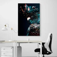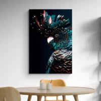 Ce Tableau Perroquet Noir montre un perroquet en gros plan sur un fond noir profond. On voit un bec incurvé, un œil clair bien visible, et des plumes aux teintes vives: un vert intense, des touches de bleu et un rouge orangé. Le contraste entre le fond sombre et les couleurs du plumage saute aux yeux. Le rendu paraît net, presque photo, avec un très bon niveau de détail sur les plumes. On distingue aussi des reflets lumineux subtils sur certaines barbes de plumes.