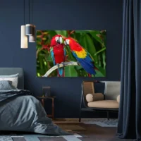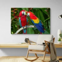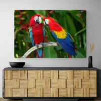Accrochez cette toile au-dessus d’un meuble en bois, dans une entrée ou un salon. Sur un mur clair, le perroquet ressort fortement. Une plante verte à côté renforce l’effet nature. Pour une composition, ajoutez d’autres tableaux d’animaux ou restez dans la même famille avec des tableaux perroquet.